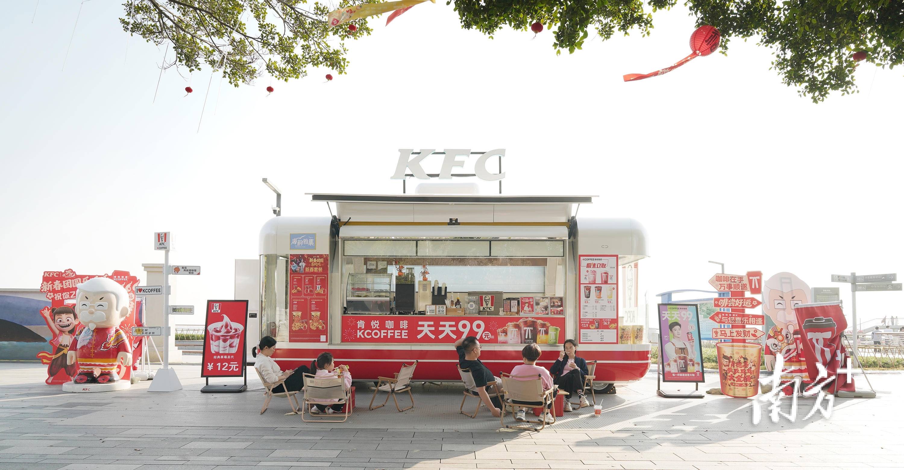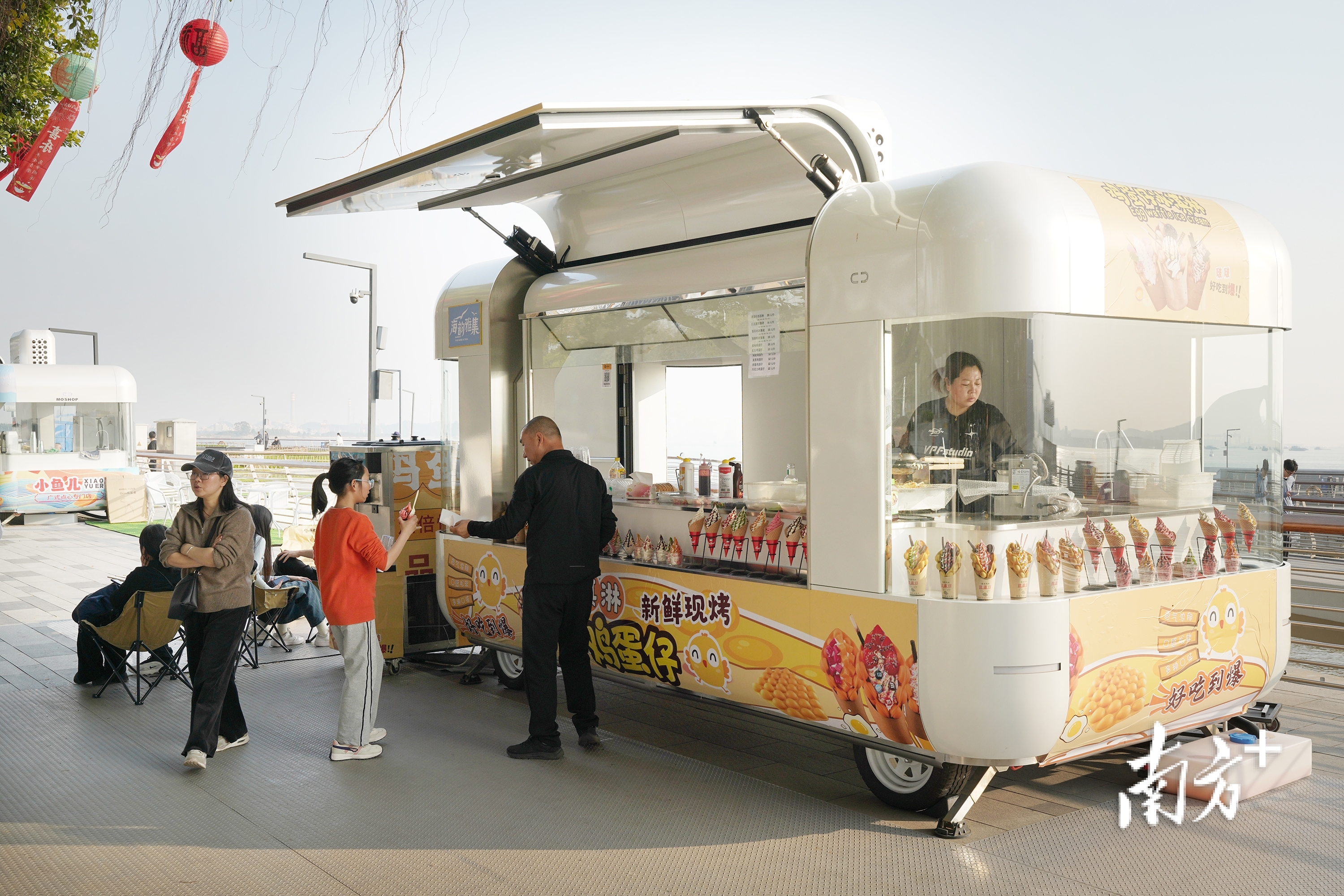 海风依旧,但海岸的“风貌”已然不同。这里汇聚了从本土风情到便捷连锁的多元选择:KFC与手打柠檬茶的入驻,为市民游客带来熟悉的快餐与网红茶饮体验;东莞手信让游客一站式带走东莞特色文创潮玩;罗森便利店能随时提供补给;港式鸡蛋仔的蛋奶甜香、热气腾腾的章鱼小丸子和各式包点,用香味俘获着过往的游人。