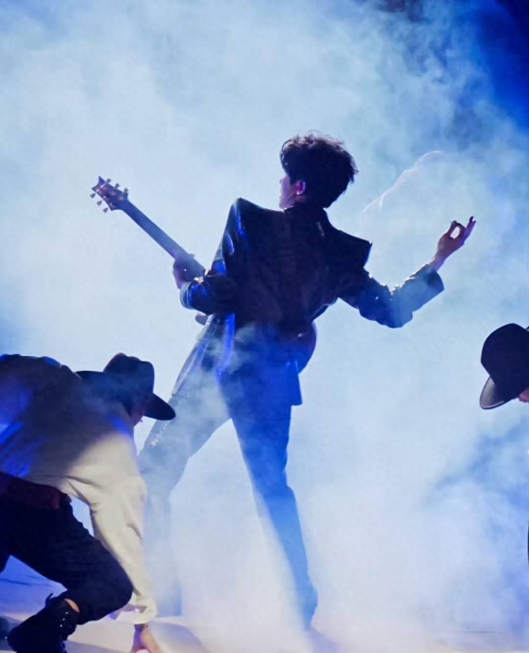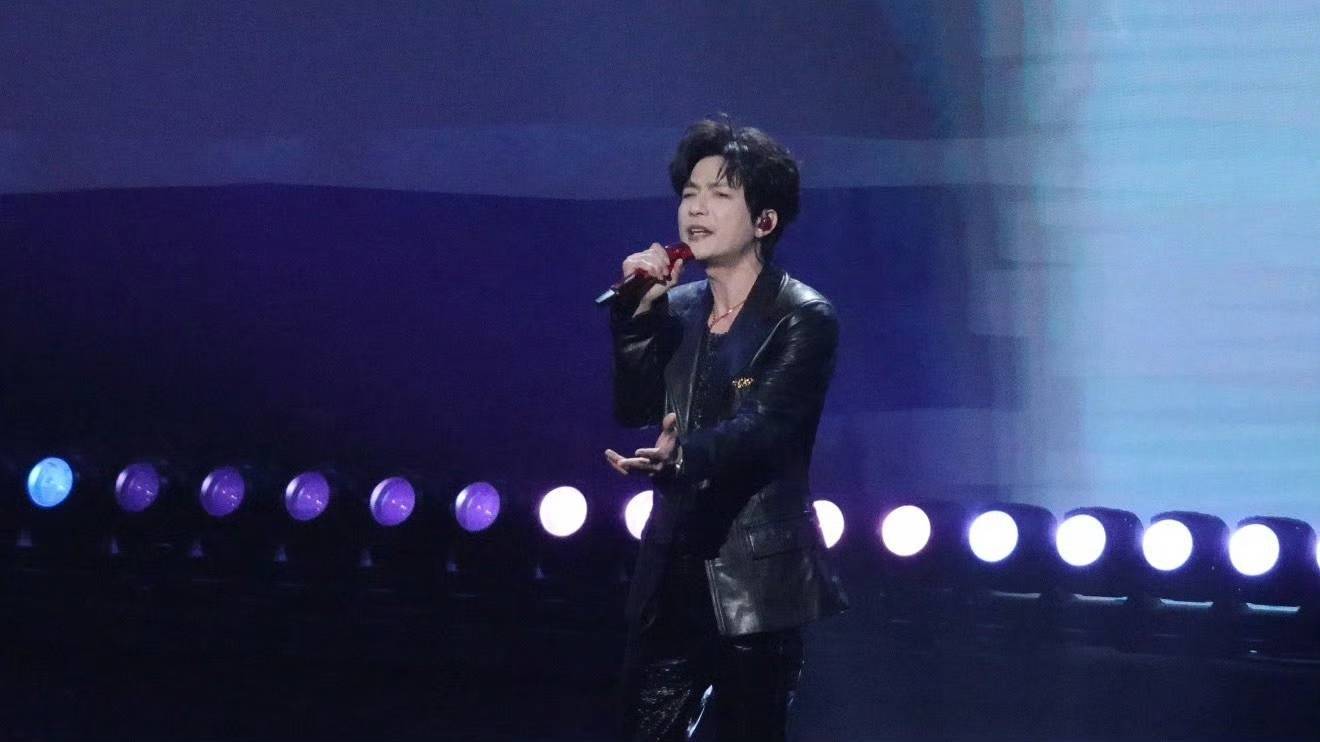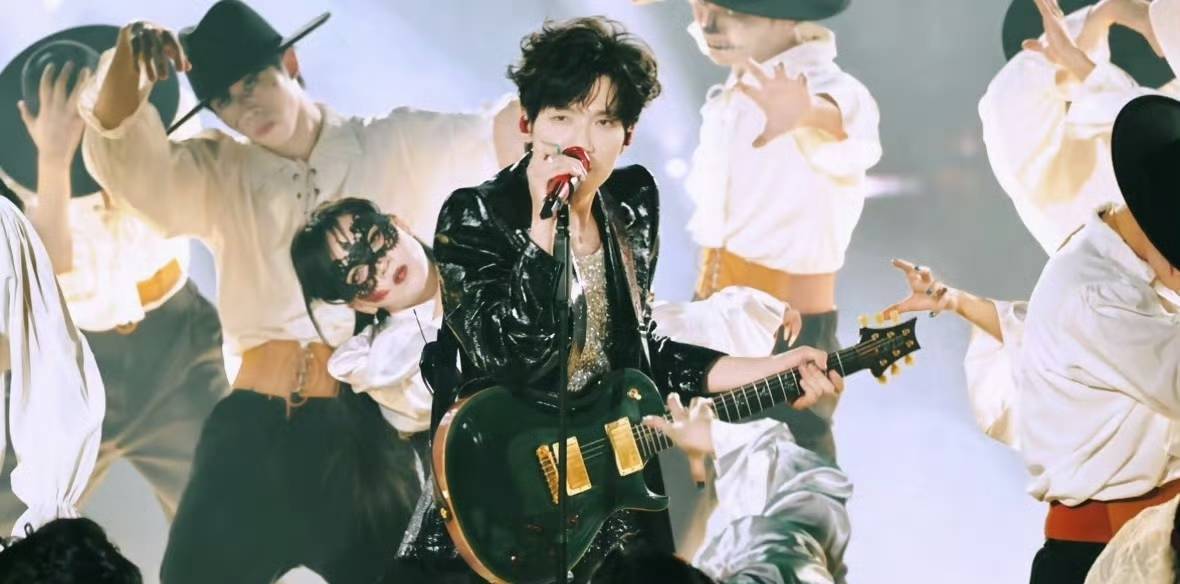他身着黑色简约礼装,利落剪裁衬出宽肩窄腰,斯文摇滚感拉满。背着重型电吉他完成流畅舞步,指尖拨弦与肢体张力完美契合,将盛典燃成沉浸式livehouse。歌曲以摇滚融合电子律动,强劲鼓点迸发炸裂能量,更守住“批判浮华、坚守本真”的核心,尽显创作与表演功力。
