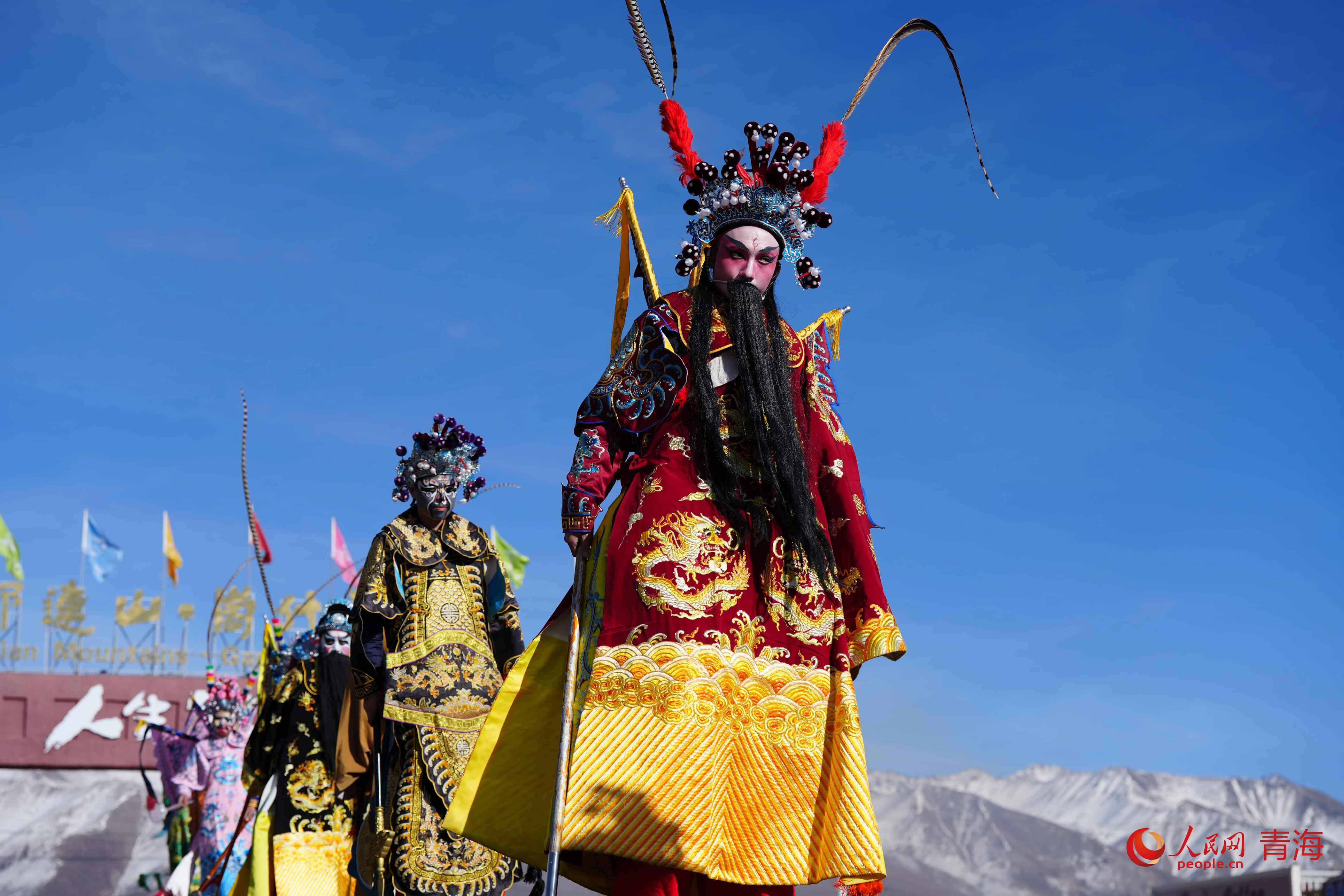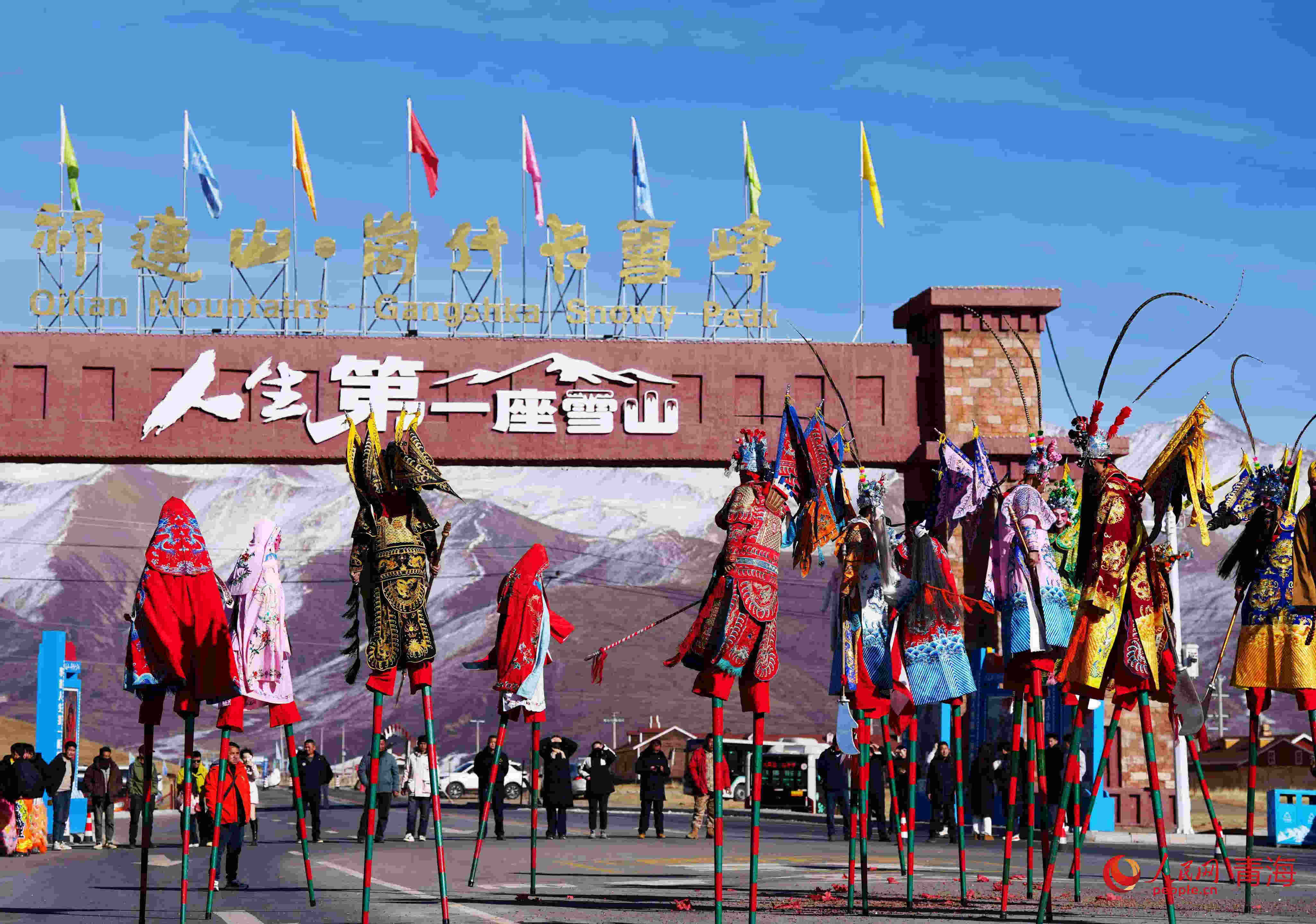 景区门口的高跷表演。人民网记者 甘海琼摄